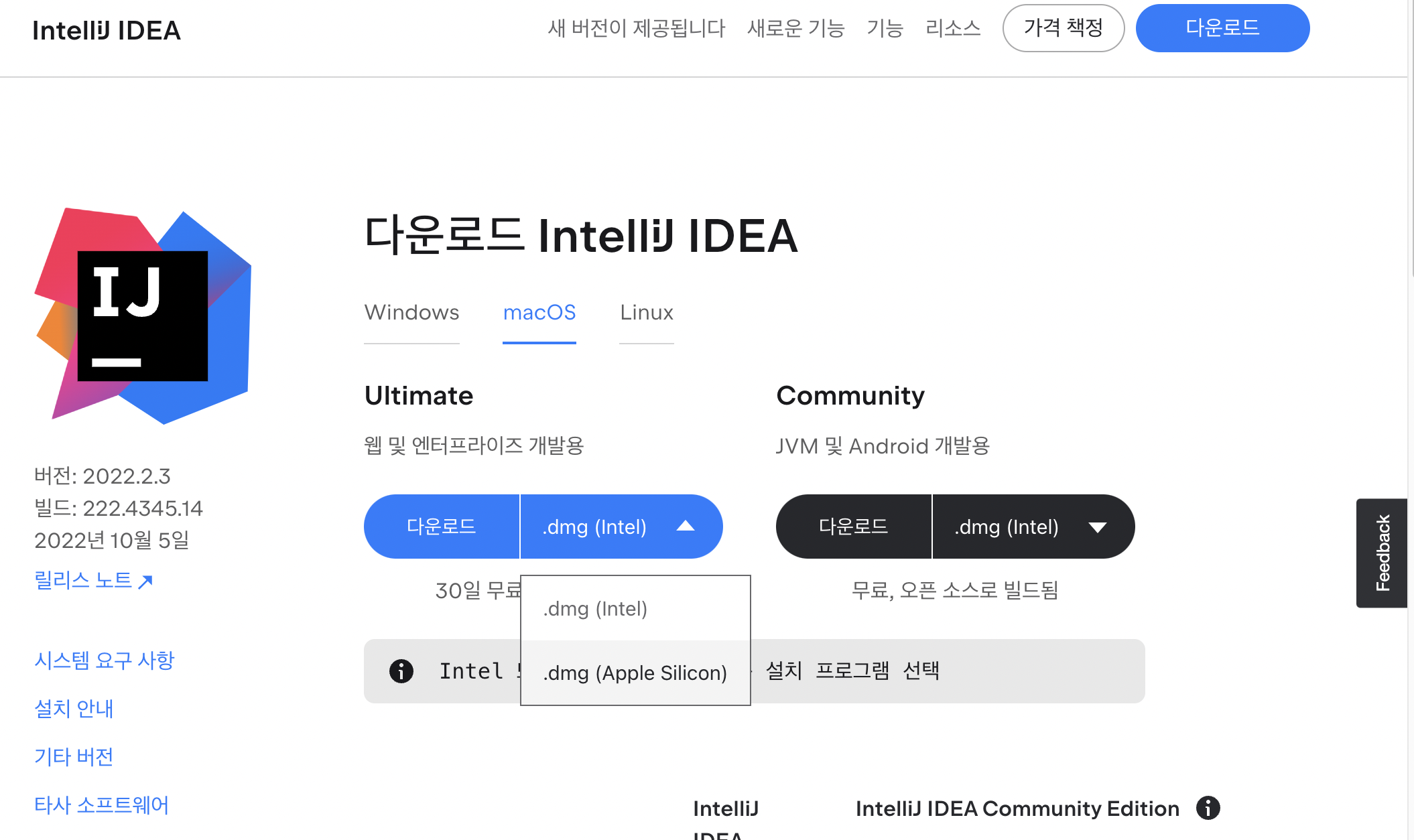 M1 버전 IntellJ 설치 : https://www.jetbrains.com/ko-kr/idea/download/#section=mac