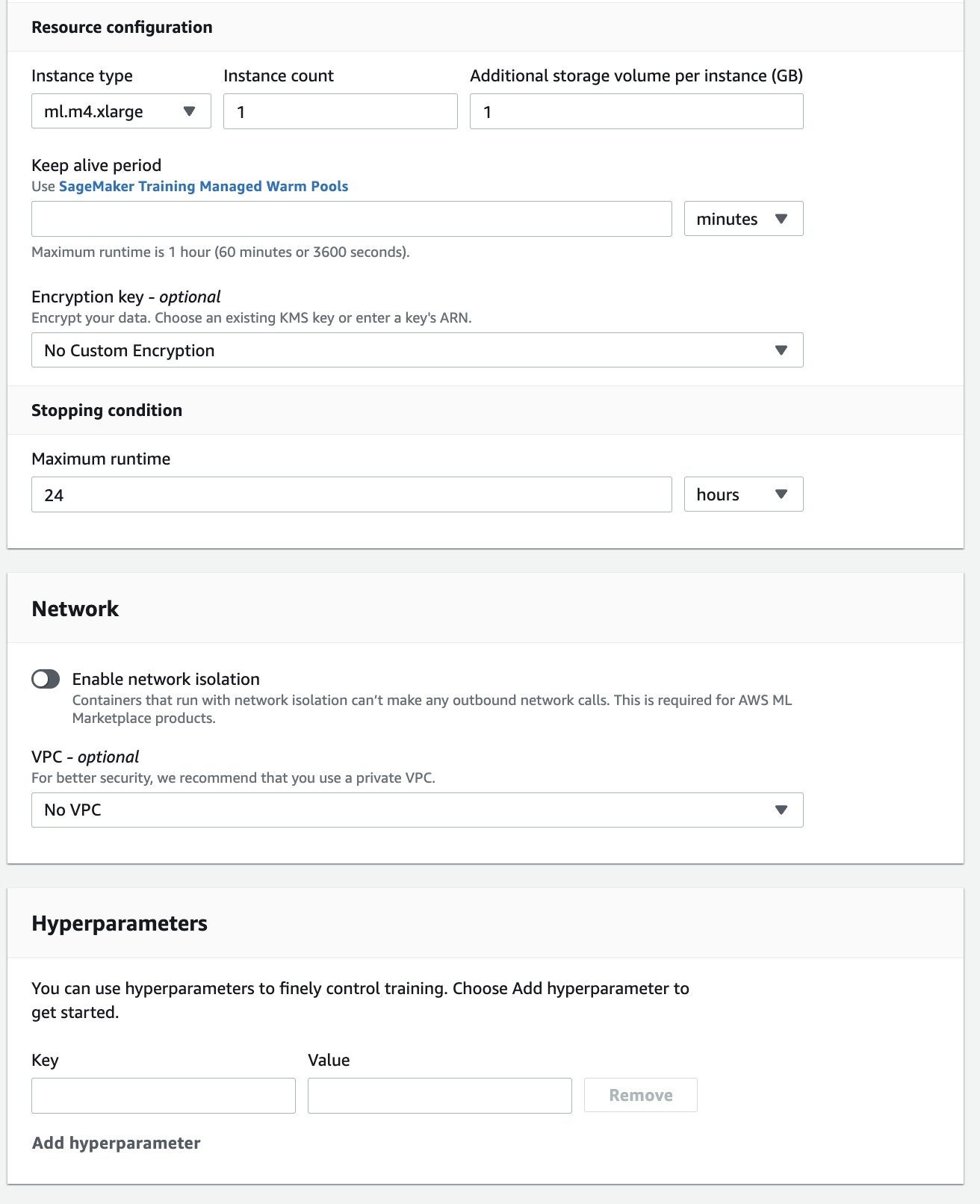 job setting: 자체개발한 알고리즘을 쓰기 때문에 그 알고리즘 소스를 가지고 오기기 위한 ecr경로가 필요하다.
