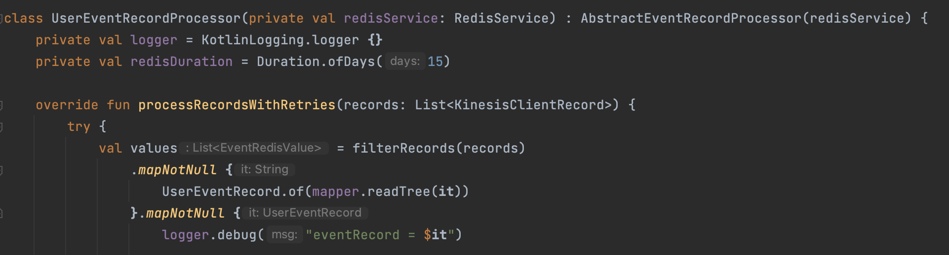 UserEventRecordProcessorFactory 에서는data stream의 shard를 어떻게 처리할지 구현한다. 여기에선 redis 서비스를 주입했다.