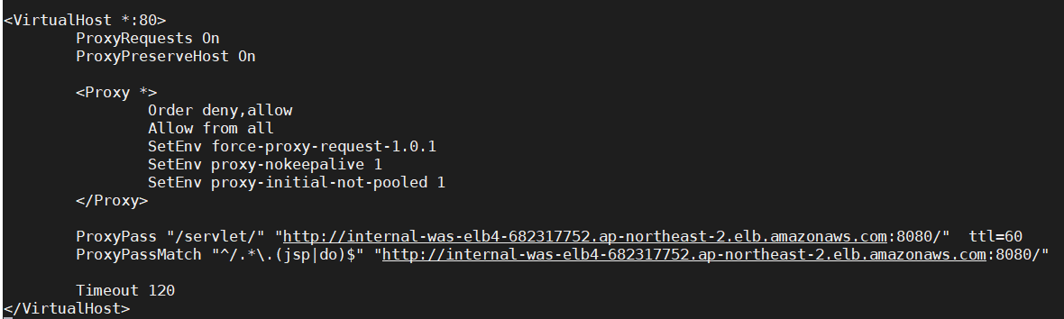 web서버안에서 다음으로 넘어갈 internal ELB주소 : 넘길포트번호