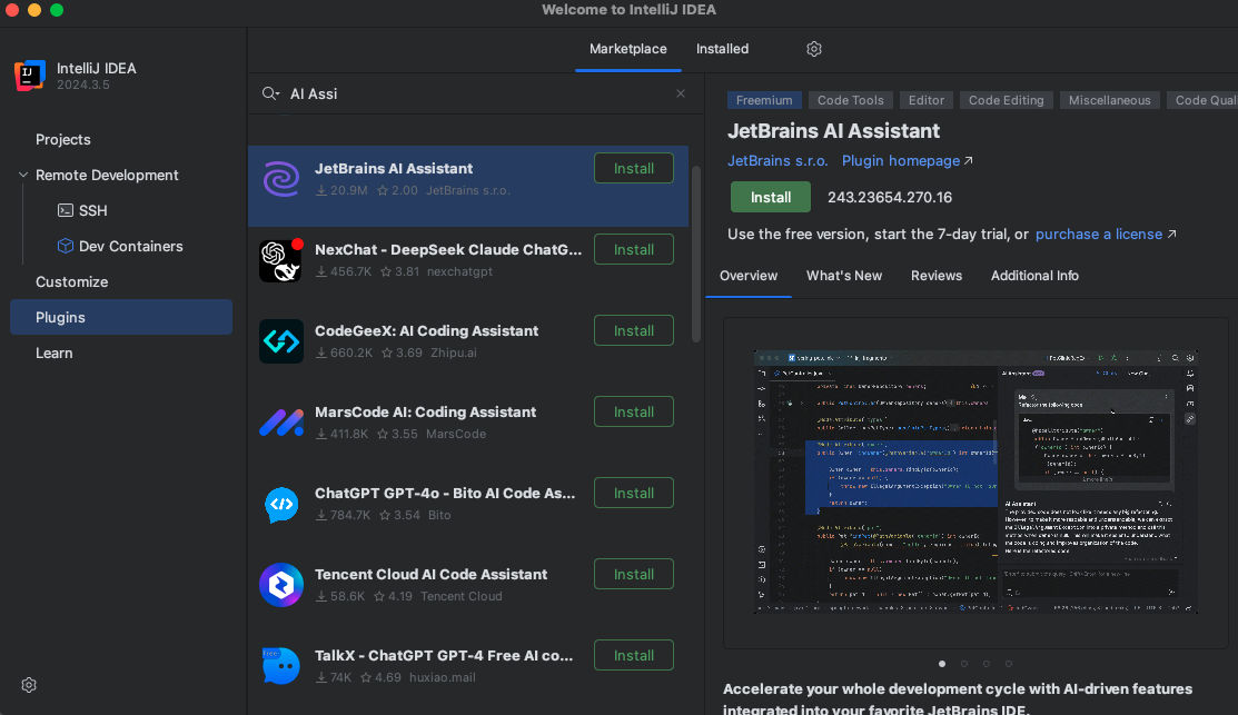IntelliJ 를 처음에 시작할때 Plugins에서 JetBrain AI Assistant를 설치한다.