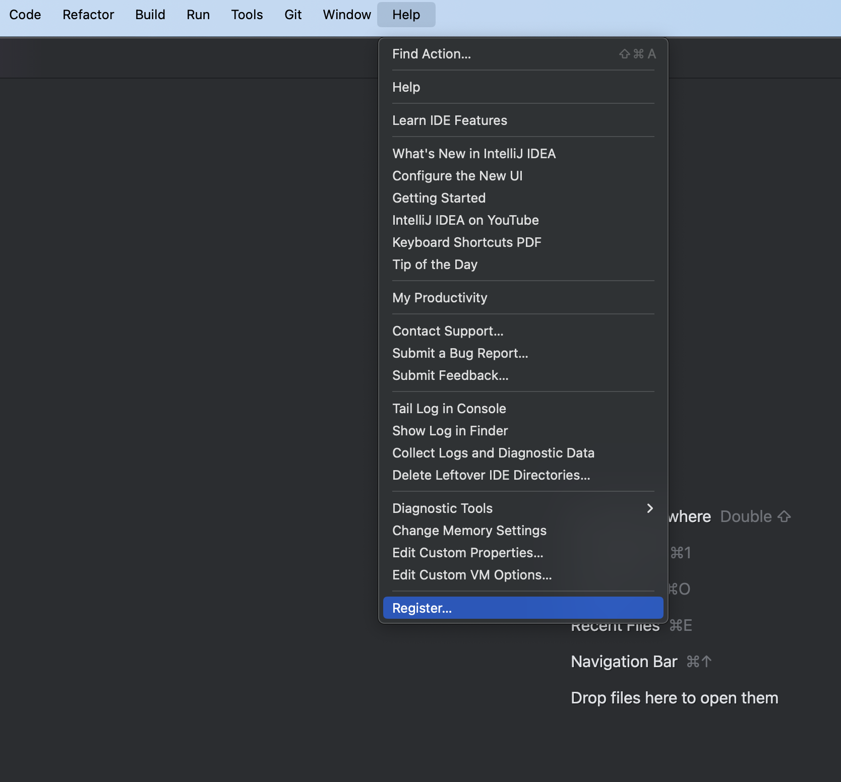 인텔리제이를 시작하면, Help > Register 로 들어간다.