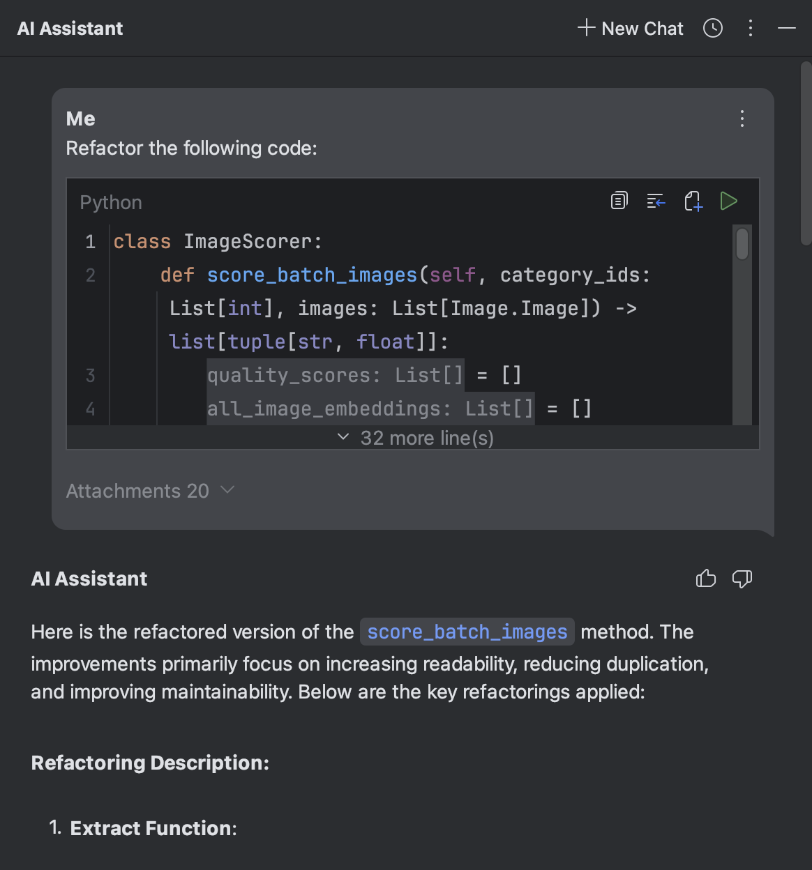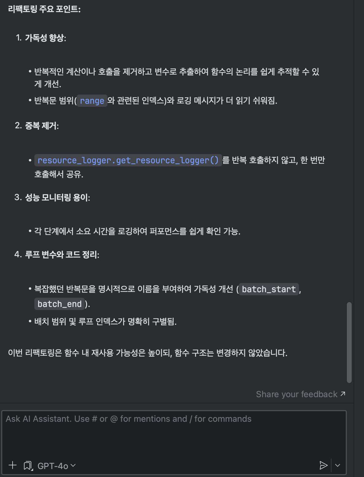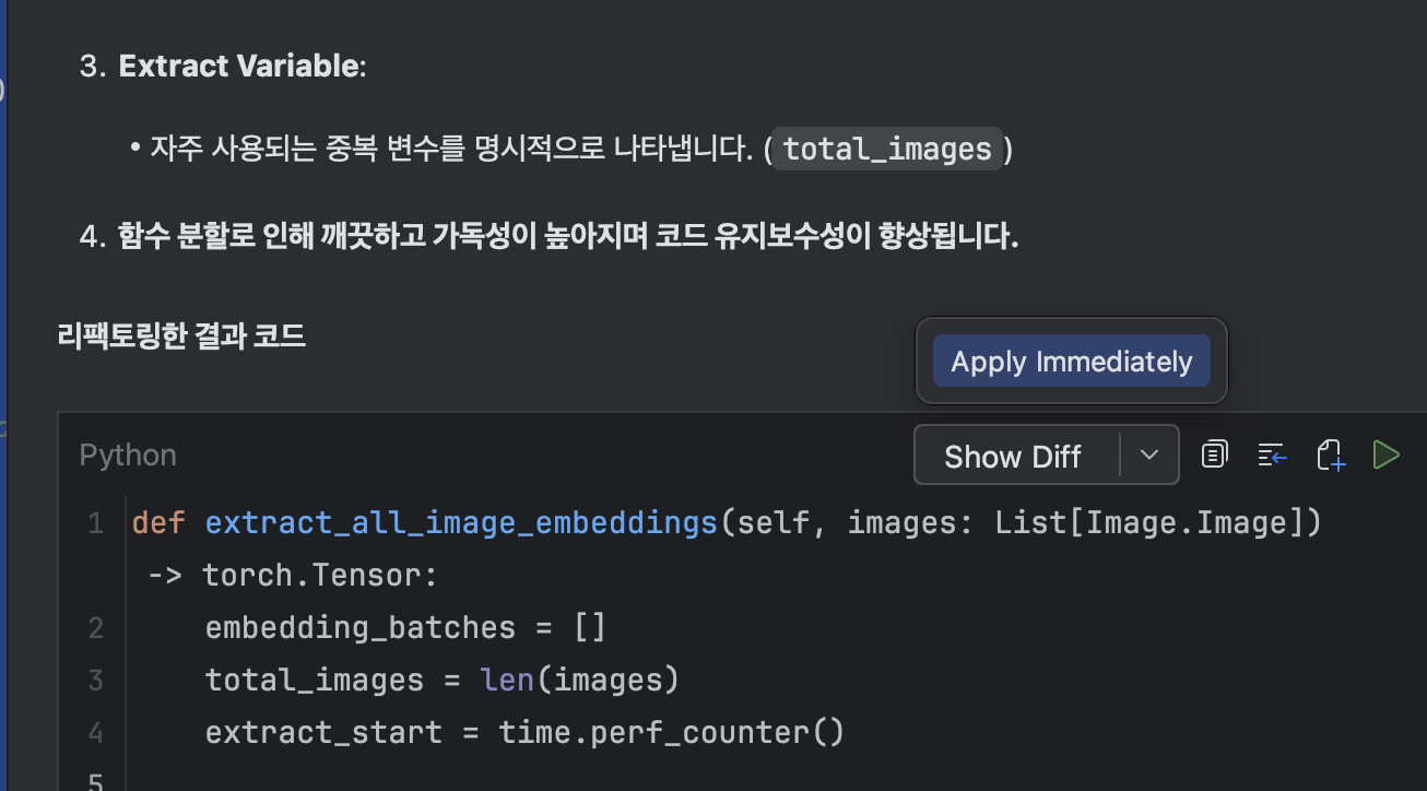 리팩토링도 꽤 괜찮게 제공해줘서 만족스러웠다. 이런식으로 리팩토링 제안을 해준다.