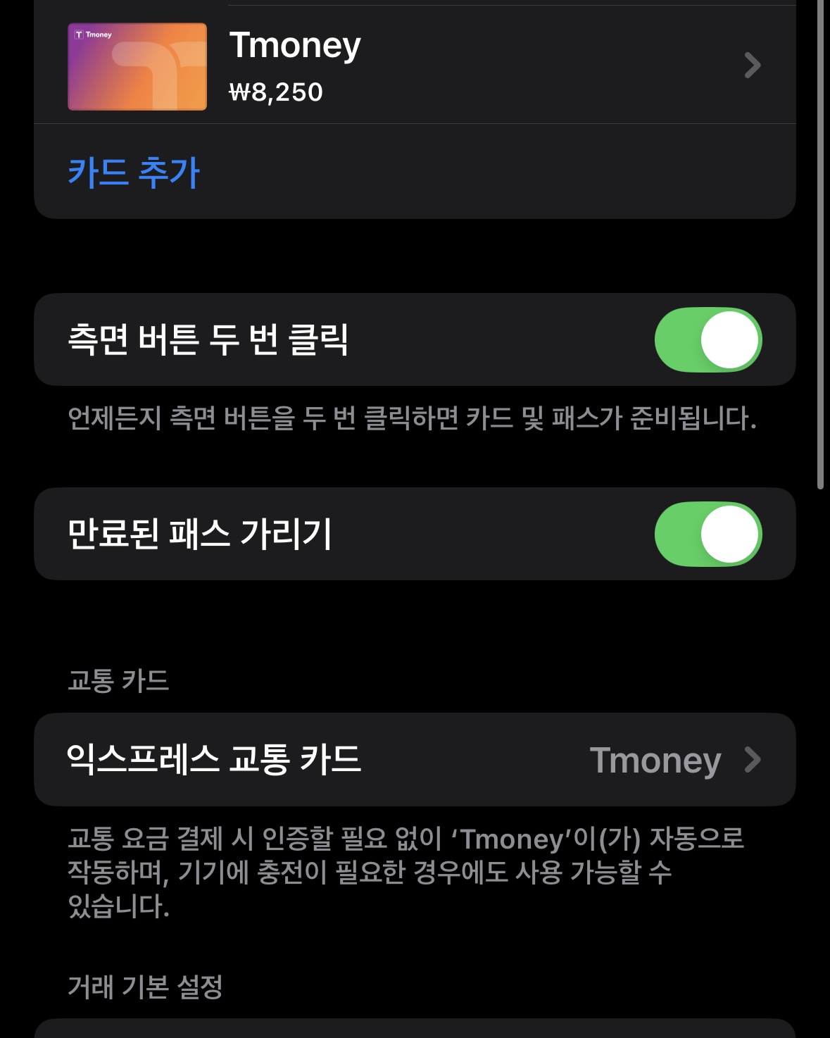 그래서 아이폰 교통카드로 티머니를 등록하고 아래와 같이 익스프레스 모드 설정이 켜져있는지 확인하면 좋을것 같다.