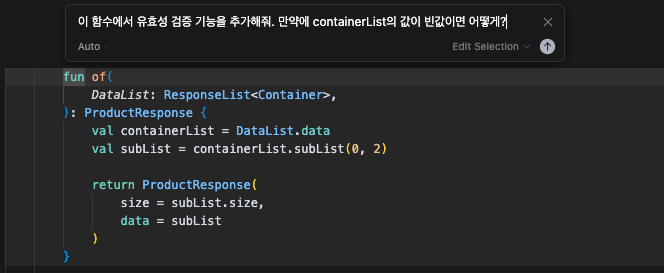 이렇게 수정을 하고 싶은 부분을 드래그 해둔 상태에서, 커맨드 K 를 해서, 바로 요청할수 있다.