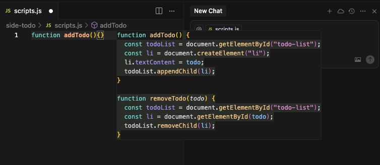 예를 들어, addTodo()라는 함수 이름을 보고 todoList를 추가하는 내용 뿐만 아니라 removeTodo 라는 코드까지 제안해줬다.
