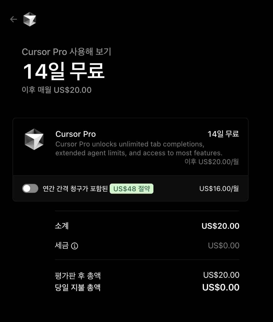 그리고 CursorAI는 무료플랜이없고, 기본 월 20$ (약 3만원)이다.
