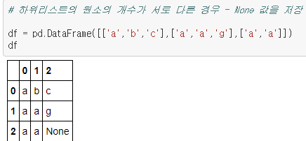 하위리스트의 원소의 개수가 다를 경우 None값저장